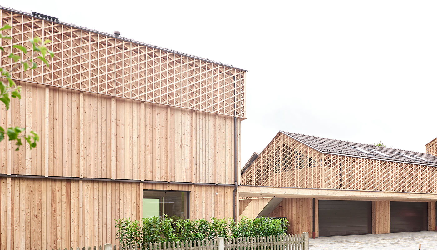 Wir brauchen Wohnraum für Familien, für Menschen, die gerne ein Eigenheim haben möchten. Und wir brauchen Architektur, die die Zimmermannsarbeiten erhalten, aber in unsere heutige Zeit übersetzen. Deshalb befinden sich nun zwei Einfamilienhäuser mit unterschiedlicher Wohnfläche auf diesem Grundstück. Holzhaus 1, welches zur Straße hinschaut bietet auf 219 Quadratmeter absolut viel Raum für Entfaltung. Holzhaus 2, das hintere, ist mit 181 Quadratmeter schon ein neues Zuhause für eine junge Familie. Beides Holzhäuser sehen fast identisch von außen aus. Eine vollflächig vertikale Holzfassade ziert die Häuser. Das Dachgeschoss wird mit diagonalen Latten versehen, das bietet Sichtschutz für die Bewohnenden und lässt noch genügend Licht in Schlaf- und Badezimmer. Bodentiefe Fenster und große Glasfronten laden viel Licht in die Wohnräume ein. Jeweils eine Terrasse mit Holzdielen bietet genügend Platz für nette Grillabende oder entspannende Stunden.